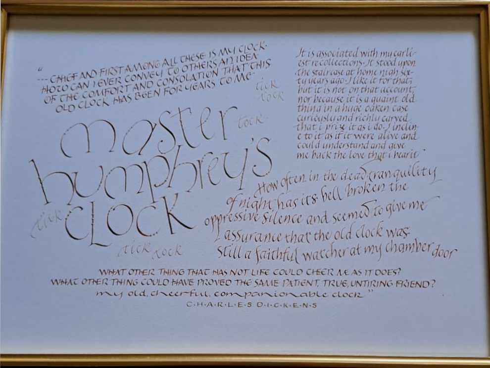 Master Humphrey’s Clock used various styles of Italic to achieve a textured look. Using square edge pens of various sizes, it is written in watercolour paint with a few tiny touches of gold.