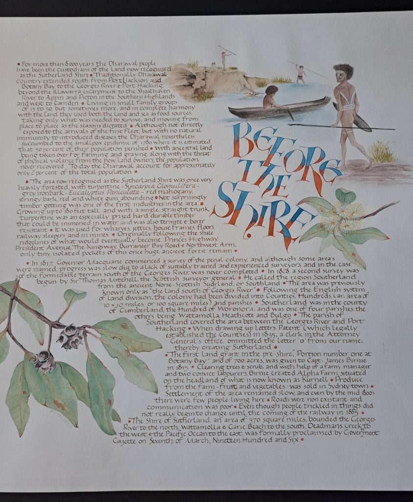 Part of a South Scribes exhibition that included all the suburbs and areas of the Sutherland Shire. This piece done on 300gsm hot press paper, using chisel nibs, ink and watercolour paints. All designs hand drawn & painted.