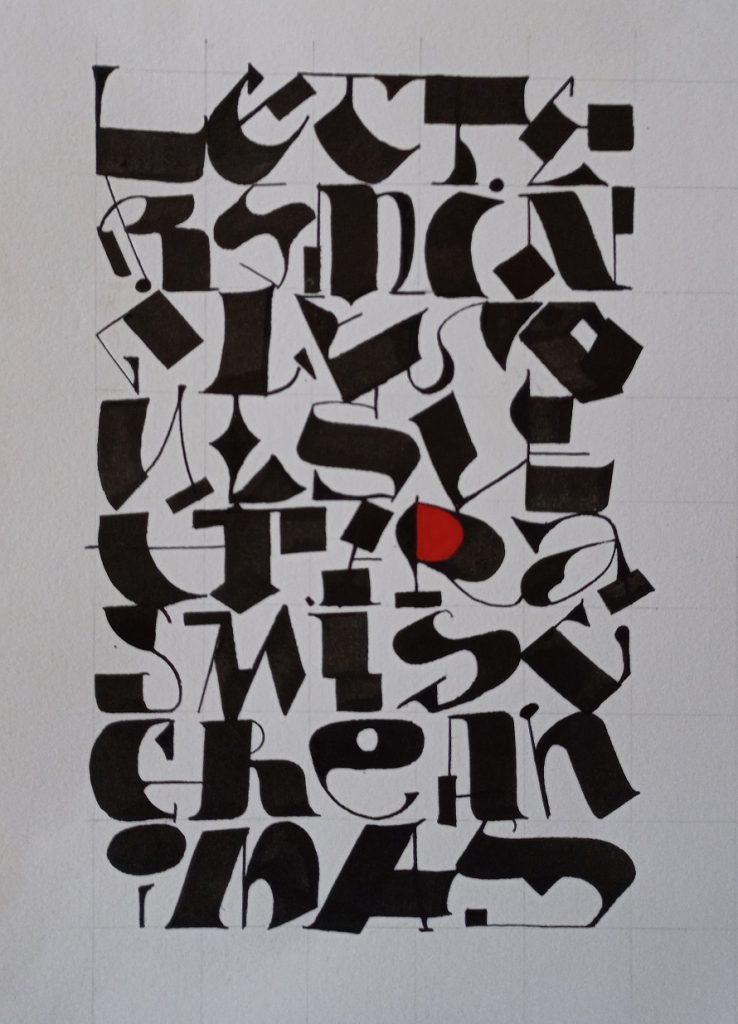 Ruling pen on black paper using Dr. Martin’s Pen White. Watercolour modern Italic and Schminke gold paint alphabet rounded.