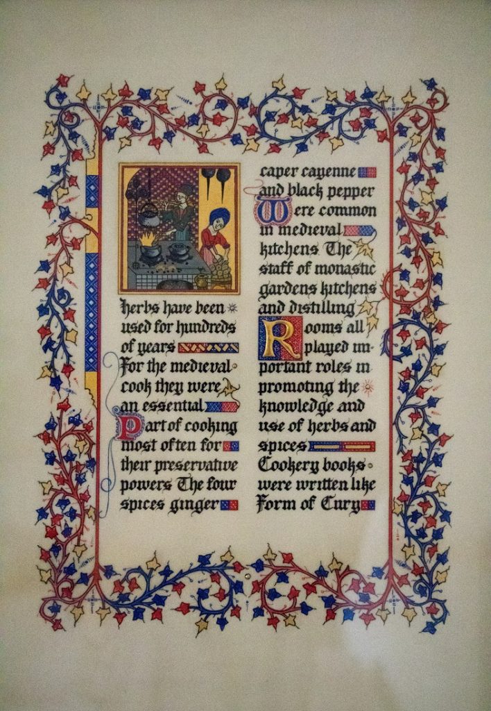 It is done on 300gsm watercolour paper, using chisel nib, ink and watercolour paint. It is decorated with a 14thC inspired French border design, painted in red and gold.