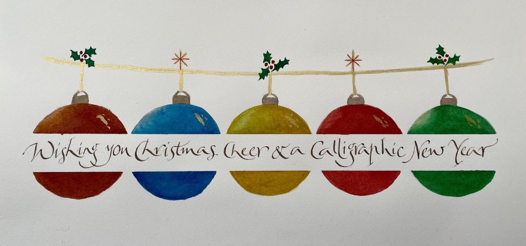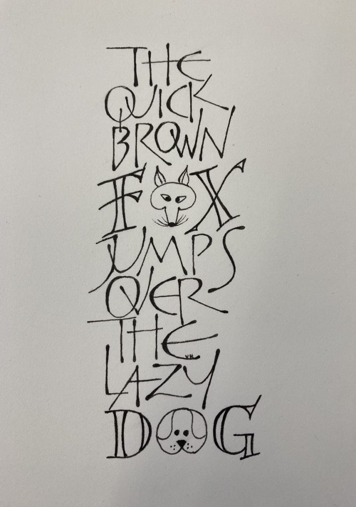 A very experienced and popular tutor, she will tell you, if asked, that she loves every area of calligraphy in its 2,000 year history; that all of the scripts, the designs, decorations, paintings, and illumination all important: that there is real pleasure in seeing the end result of long hours of work, whether that work is traditional or modern or experimental, and that the pleasure increases a hundred fold when a student produces something lovely and special.